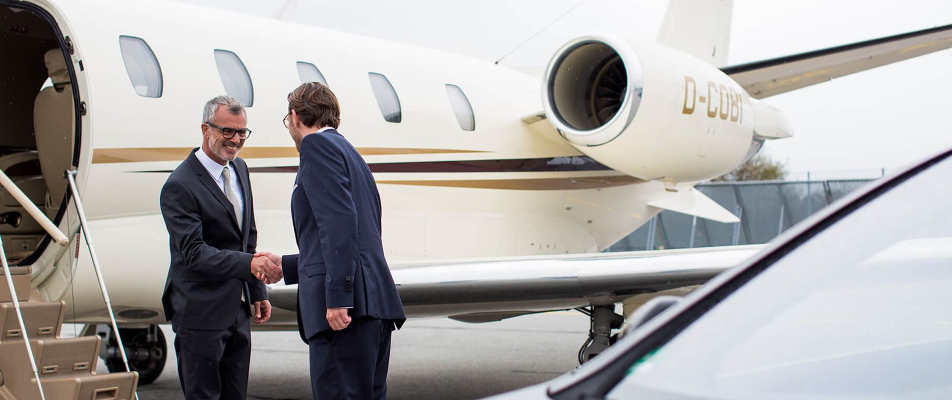 Ein Chauffeur öffnet die Tür einer Limousine, auf dem Rollfeld vor einem Business-Jet.